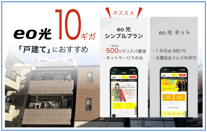 eo光の10ギガは戸建てならおすすめで、特にeo光シンプルプランが1年間月額500円とお得です。