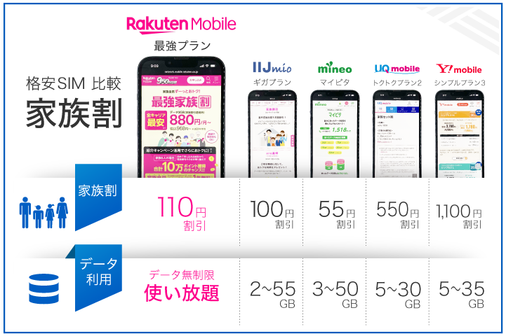 家族割のある格安SIMでおすすめは、データ無制限がコスパ最強の楽天モバイル、もしくは料金がシンプルに安いIIJmioです。